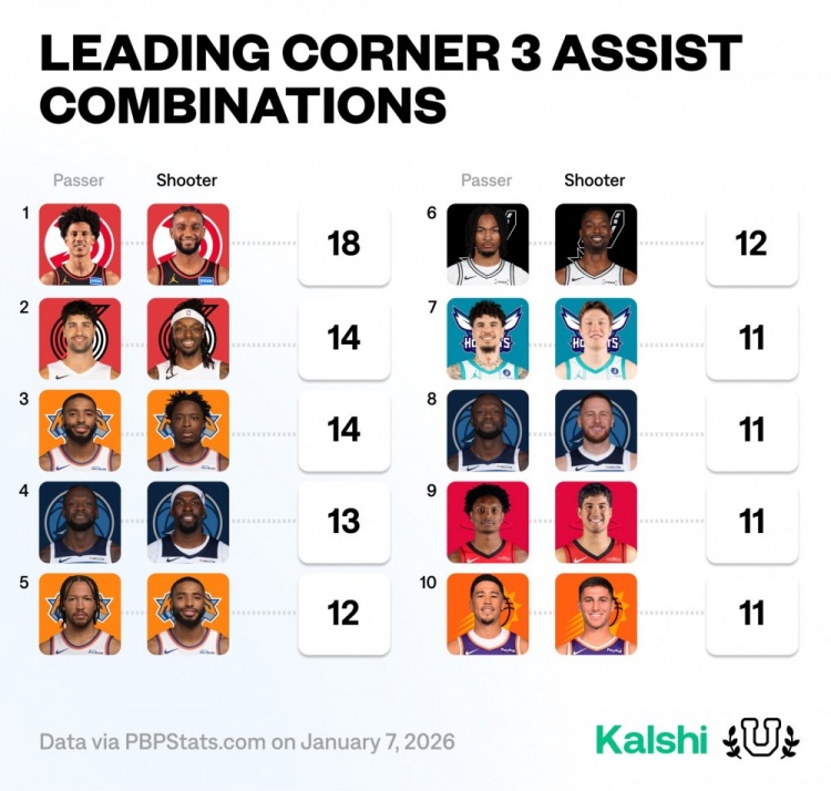 开云下载-本赛季底角三分传射组合榜:杰伦约+沃克高居第1 阿门+谢泼德上榜